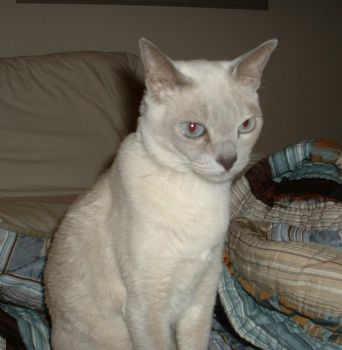 The Tonkinese has a soft, short coat with a curling cowlick on its chest.